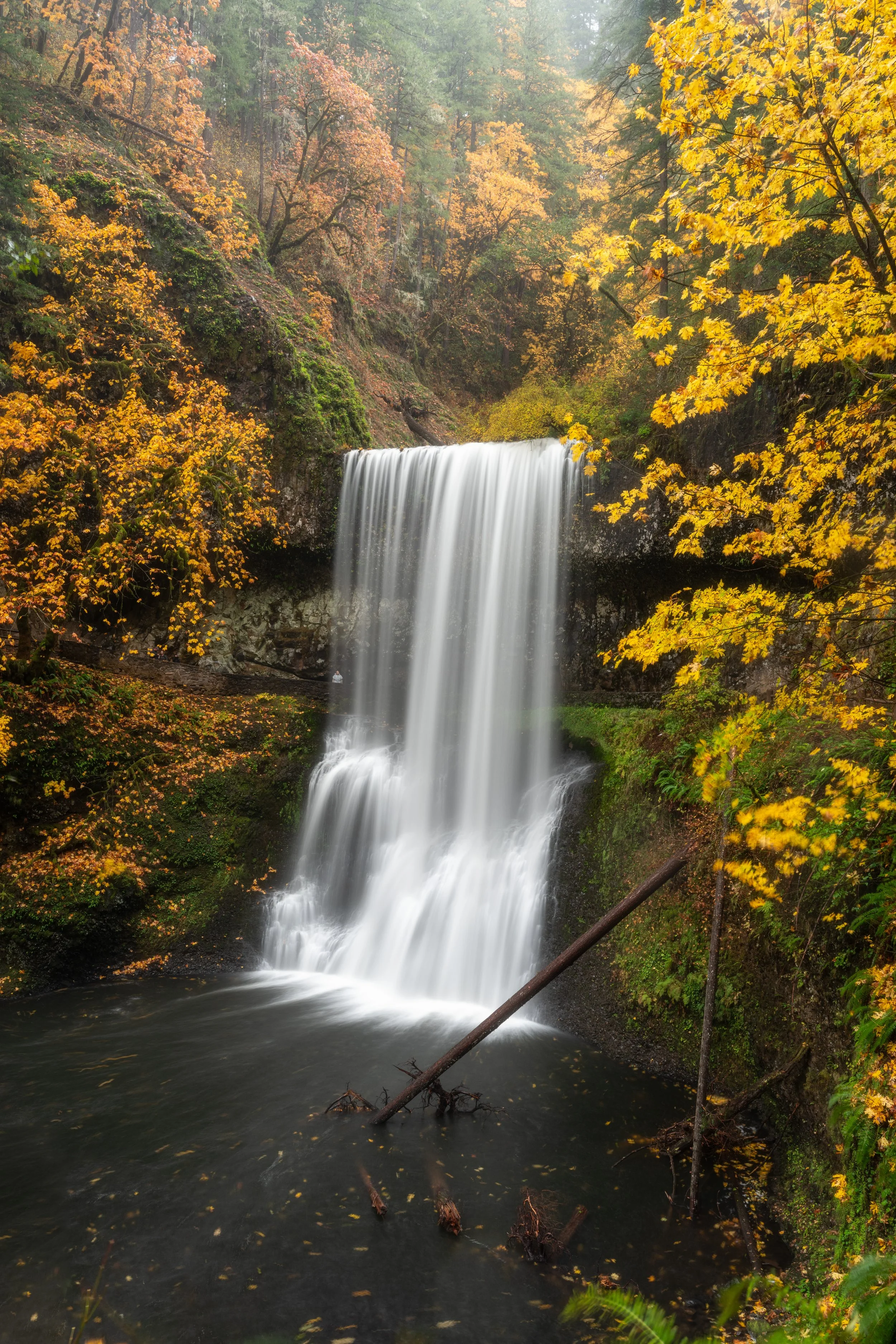 Perhaps you can’t see it well on a smaller screen, but the slow shutter speed—2 seconds, I believe—allows us to see through the water. A woman behind the falls is looking up, and she kept still long enough to stay pretty sharp. For me, that moment is worth having some extra motion in the leaves around the edges.